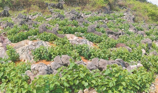 而现在,荒山裸石已难觅踪影。在平果市马头镇古念村种桑养蚕脱贫奔康产业园,我们好不容易才找到一片尚未被桑叶遮蔽的石山。
