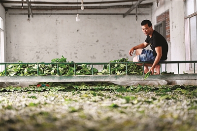 上图为村民在家里给蚕虫喂食。