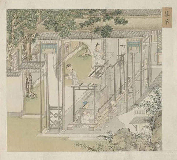汉代出现的还有纺织题材的画像石。蚕桑丝绸题材在宋代得到了更加的重视。目前现存最早的《蚕织图》是有着南宋吴皇后题注的版本。耕织图对后世的影响非常大,到清代康熙年间,宫廷画家焦秉贞又根据皇帝的意图绘制了新的一套《耕织图》,康熙皇帝亲自为其题诗,成为有清一代所有《耕织图》的范本。
