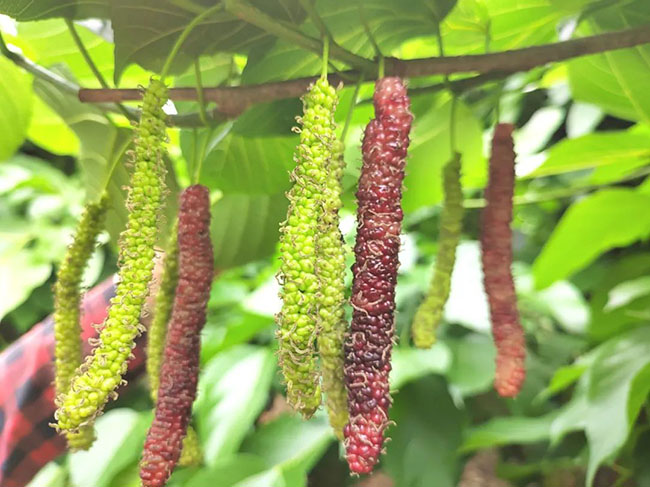 除供应鲜果外,当地还将桑葚加工成桑葚干、桑葚酒等产品,有效促进当地农民增收。据了解,东南村200多亩桑树园年产桑葚鲜果超200吨,产值可达160多万元,在收获季节还能为周边群众提供摘果岗位30个,每人每日收入120元。“桑葚营养丰富,深受消费者追捧,目前收购价每斤4元左右,我种植3亩,预计收入大概2万元左右。”村民蔡子隆介绍,“桑葚园结出了‘致富果’,我们农民的日子过得越来越红火!”