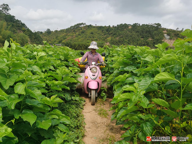 平秦组是一个有上百户人的小村落,圭江河绕村而过。记者在该村所见,如同诗句描述的情景,房前屋后,但凡有利用的空间,全部种满了桑树;河边数百亩的滩涂坡地更是成为连片桑树林,高大的桑树有成人这般高,风吹过,桑树林随风起伏,如碧浪翻涌,此时有10多位桑农正在采摘桑叶。