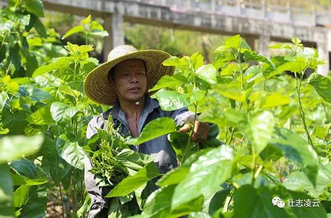 草木繁盛的五月,阳光明媚。走进凌云县下甲镇彩架村,连片的桑树林在阳光下泛着绿油油的波光,扑面而来的绿意令人心旷神怡,蚕农们穿梭在蓊郁的桑林间,熟练地采摘新鲜桑叶,给蚕宝宝准备伙食。