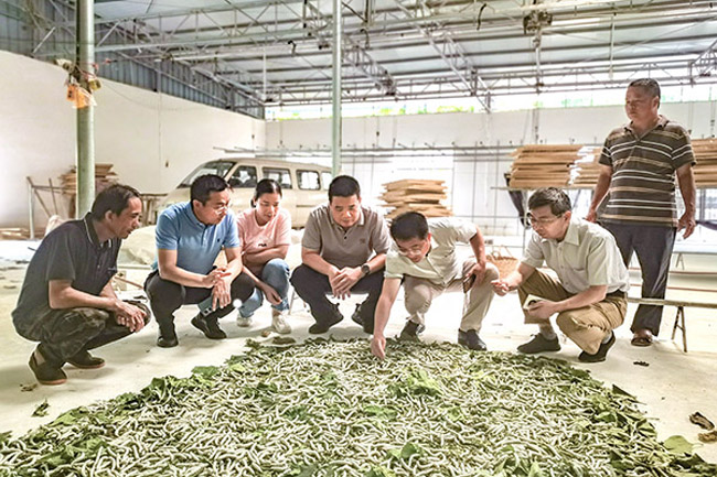 随后,调研组先后到松山村巴敏屯大蚕房、小蚕共育室,竹笼屯海军援建新建蚕房点,村集体投资建设的大蚕房点和村民养蚕点等地开展实地调研,到现场深入了解小蚕共育情况、大蚕饲养情况、桑树种植情况及当前发展蚕桑产业面临的具体问题等,从桑树种植管理、蚕病防治等方面向蚕农们作了详细的指导,还因地制宜地针对当前蚕季高温干旱的特点,指导养蚕户采取相应措施,保证蚕茧能够安全度夏。