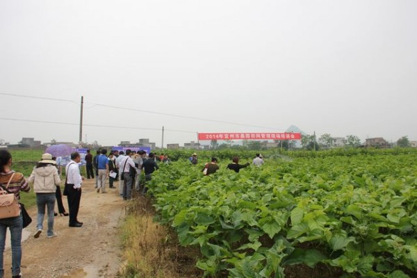 2014年5月7日下午,宜州市召开2014年桑园田间管理现场会。针对近期雨天偏多,光照不足,田间湿度偏高,树势弱,桑园各种病虫害高发宜州市领导梁宁、吴兵、梁基武、蓝焕斌、韦思荣等及全市16个乡镇政府分管领导、农业技术推广站负责人和市直涉农单位领导等近60人参加会议。