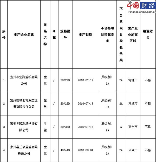 本次主要以《2016年生丝产品质量广西监督抽查实施细则》为检验依据。经检验,宜州市宏翔丝织有限公司、宜州市城西常乐茧丝绸有限责任公司、隆安县隆利源丝业有限公司、象州县三联茧丝有限责任公司等4家企业的4批次样品不合格,涉及级别1个项目。