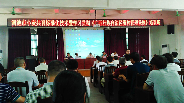 为更好地促进全市蚕业产业发展,提高小蚕共育户的小蚕培育技术,增强蚕种经营户的安全生产、经营意识,同时提高农业执法人员在蚕业领域的执法效能,7月28日上午,河池市农业局主办的小蚕共育标准化技术暨学习贯彻《广西壮族自治区蚕种管理条例》培训班在宜州区召开。市农业局副局长覃家旺、执法支队长潘炳章、蚕业推广站站长黄康东等领导、专家出席了开班仪式。参加此次培训班的人员主要有河池市各县、区农业行政部门的执法人员、蚕业站工作人员及蚕种经营户、小蚕共育户等共252人。 南丹县农业局执法大队干部、蚕业站技术人员带领南丹县小蚕共育、蚕种经营代表户等一行5人参加培训。