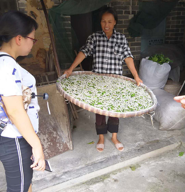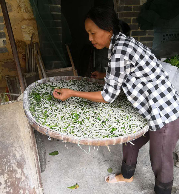 9月17日,笔者跟随浦北县农业局经作站技术人员,来到浦北县“东桑西移”项目泉水镇桑蚕养殖基地。技术人员正在喂养幼蚕虫,添加新鲜的桑叶。据了解,钦州市实施“东桑西移”项目在泉水镇建设种桑园、养蚕大棚、小蚕共育室等示范样板基地、设施,通过招商引资政策,引导广西桂合集团投资创建绸丝蚕丝加工厂,并授权浦北县桂合丝绸有限公司为承担单位。