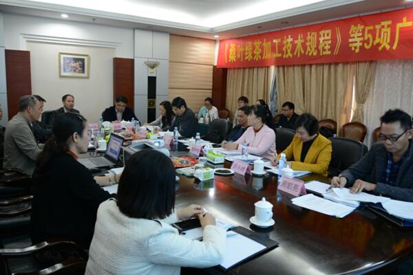 2018年11月17-18日,广西壮族自治区质量技术监督局在南宁召开由自治区农业农村厅提出、广西蚕业技术推广总站起草的《桑叶绿茶加工技术规程》《桑叶挂面加工技术规程》《桑枝栽培灵芝生产技术规程》《桑果醋饮料加工技术规程》《食品用桑叶粉加工技术规程》等5项广西地方标准审定会。自治区质量技术监督局标准化处、自治区绿色食品办公室、广西蚕业技术推广总站相关领导及编写小组成员共18人参加会议。专家组由桂林理工大学商川教授、广西标准技术研究院高级工程师曾云清等7人组成。