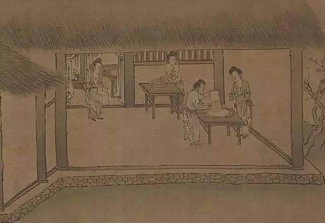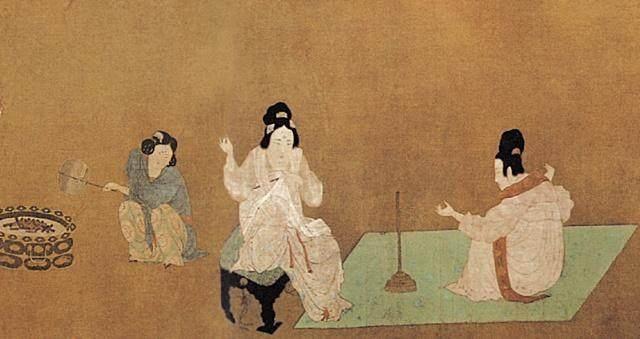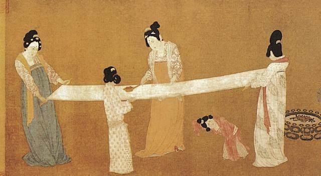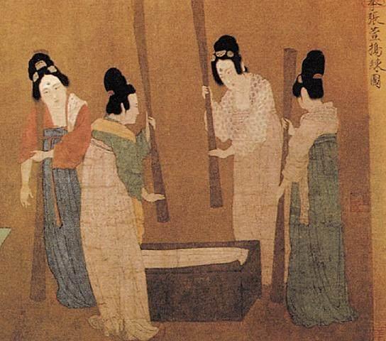 唐代 张萱 《捣练图》用三组生动的画面,描绘了宫中妇女捣练的情景。