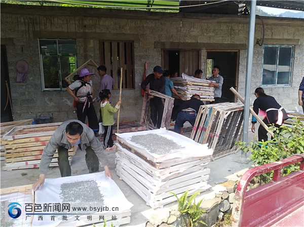 3月26日,凌云县朝里瑶族乡百朝村六东育蚕点,小蚕供育人员在分发蚕种。
