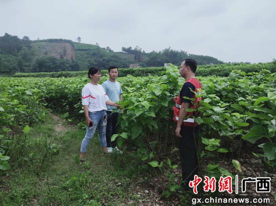 农业技术推广站工作人员在查看桑叶长势。农业技术推广站工作人员在查看桑叶长势。